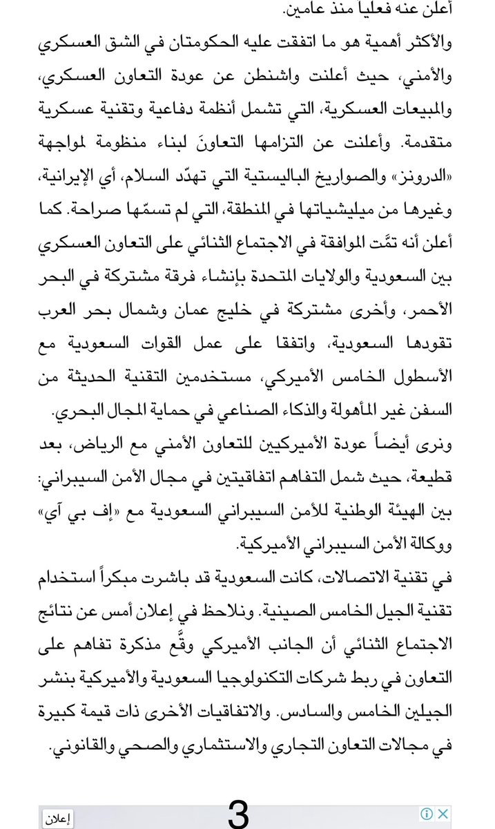 عدا ما لم يُعلن، وربما تمَّ التفاهم عليه من الترتيبات الاستراتيجية، فإنَّ ما صدر رسمياً، في حد ذاته، يشكل تطوراً مهماً في العلاقات والتعاون. في نظري، الجانب الأكثر أهمية فيه هو عودة #الولايات_المتحدة إلى التعاون العسكري مع #السعودية. وبالتالي يمكن أن نقول إنَّ الولايات المتحدة