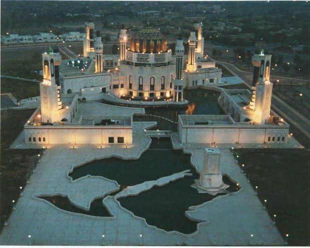 وهيئة المسجد على شكل خارطة الوطن العربي حيث ان البحار المحيطة بالوطن العربي ممتلئة بأحواض بحيرات ماء داخل المسجد