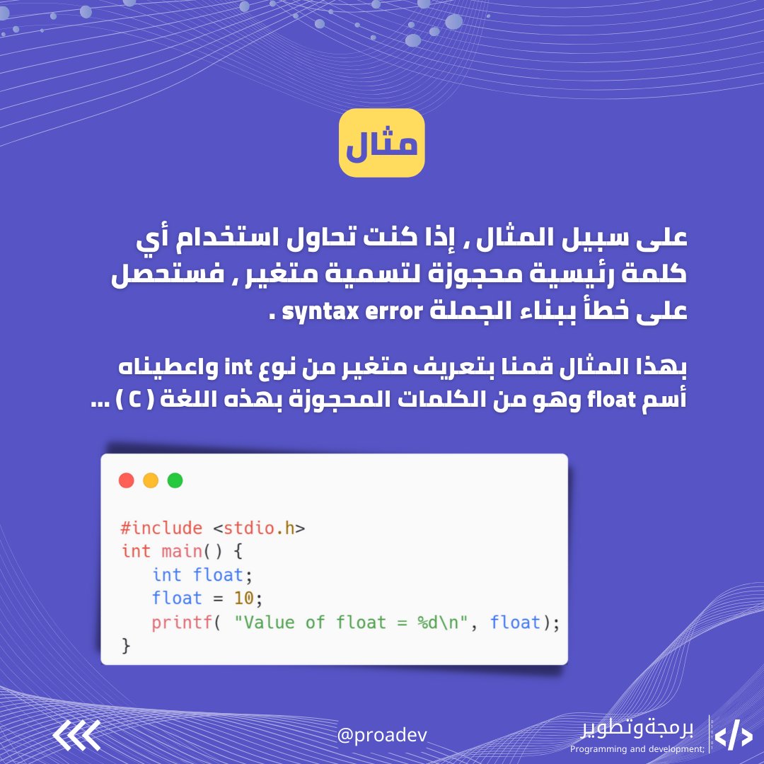 ومن أشهر الكلمات المحجوزة بلغات البرمجة , هي أنواع المتغيرات مثل int , float , double ولا يمكن تسمية متغير مثلا ب int لانه يعتبر كلمة محجوزة باللغة .