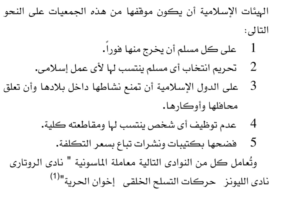 من ضمنها القرار الحادي عشر والذي كان يتمحور حول الأندية الماسونية التي انتشرت في ربوع البلاد العربية والإسلامية مثل مصر والعراق وغيرها وكان نصه كالتالي: