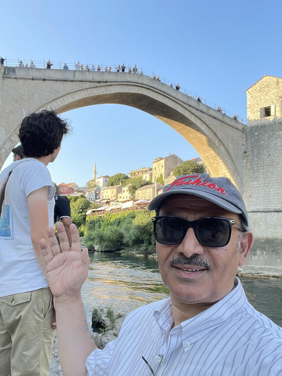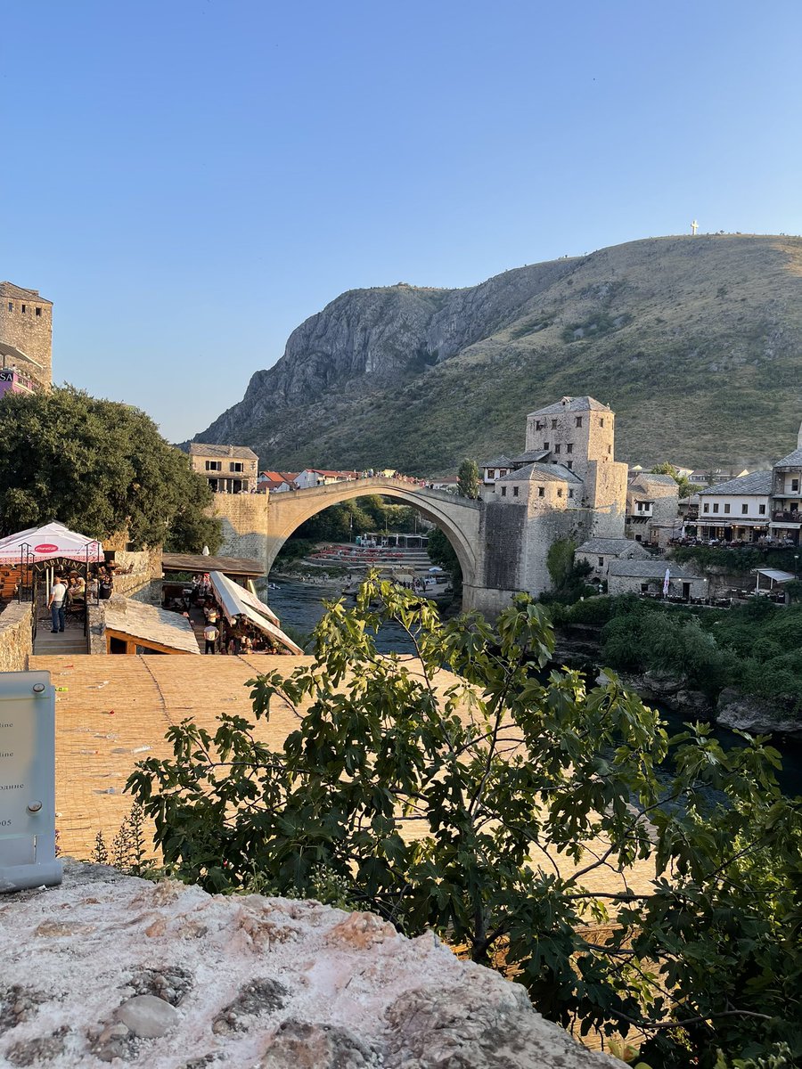 من أعلى الجسر العثماني بمدينة موستار جنوب البلاد الذي تم تدميره في الحرب البوسنية مع الكروات قبل عشرين عام وتم إعادة بناءه بنفس الشكل القديم ويعتبر المعلم السياحي الأول في المدينة وتقع على جانبيه الاسواق والمطاعم والكافيهات ../ يتبع