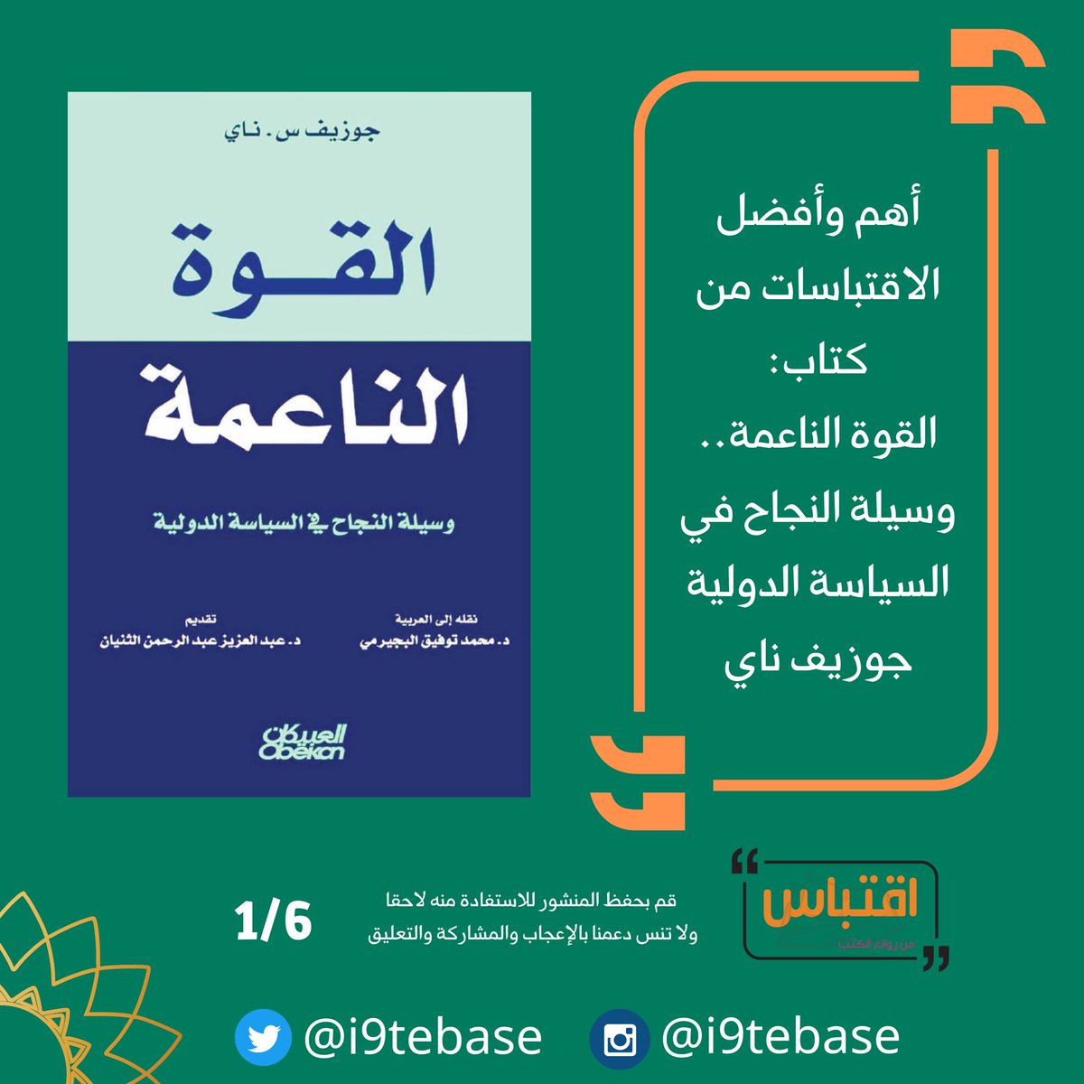 #ثريد يحتوي خمسة من أفضل الاقتباسات عن كتاب: القوة الناعمة.. وسيلة النجاح في السياسة الدولية، جوزيف ناي