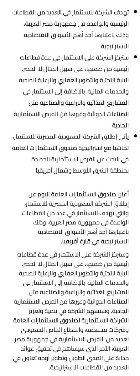 قبل شهرين متوافقة مع دعوات الإصلاح والتحرير.. أول المشاركين من جانب مصر هم رجال الأعمال المصريين الجدد ورجال الأعمال السابقين الي خايفين من المنافسة فيبغون يتطورون مع رؤية الحكومة.. وأول المشاركين من جانب الاستثمار الأجنبي هو صندوق الاستثمارات عبر الشركة السعودية المصرية.. لمصلحة