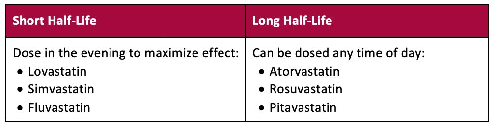 تنقسم الستاتينات أيضًا من حيث فترة عمر النصف او بمعنى اخر مدة مفعولها الى: