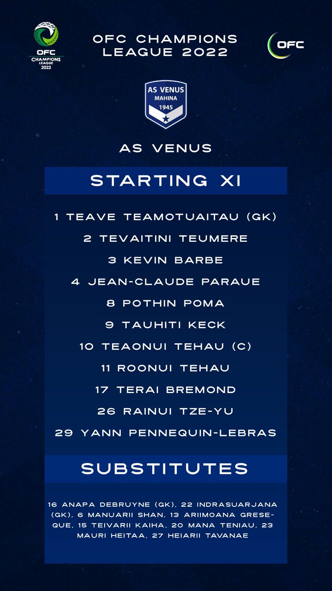 يلتقي في الرابعة فجر الأربعاء بتوقيت القاهرة فريق فينوس التاهيتي(بولينيزيا الفرنسية) مع فريق أوكلاند سيتي النيوزيلندي في نهائي دوري أبطال أوقيانوسيا لموسم ٢٠٢١-٢٠٢٢م.
