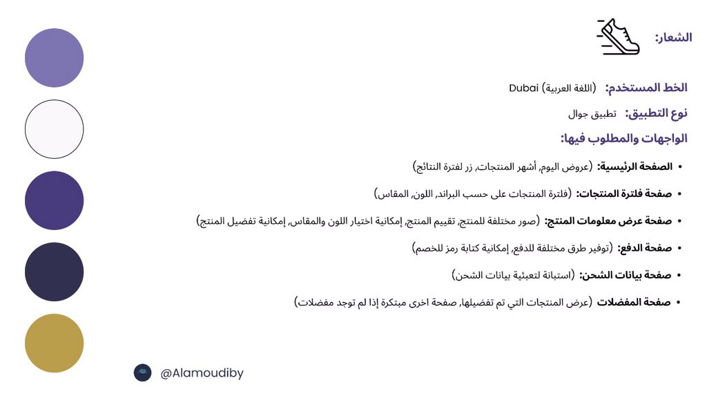 فكرة التحدي عبارة عن تصميم واجهات تطبيق جوال لبيع أحذية بناء على المذكور في التحدي. مثلاً وضحت ايش الواجهات المطلوبة ومحتواها، الشعار، الألوان، نوع الخط المستخدم، ولغة التطبيق.