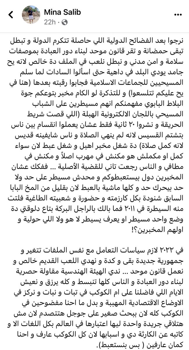 لكن انا مش شايف المسيحيين شركاء وطن، شايفهم مصريين عندهم مشاكل مينفعش ننكرها ولا ينفع لما نتكلم عنها نقول مينفعش أصل كلنا عندنا مشاكل.