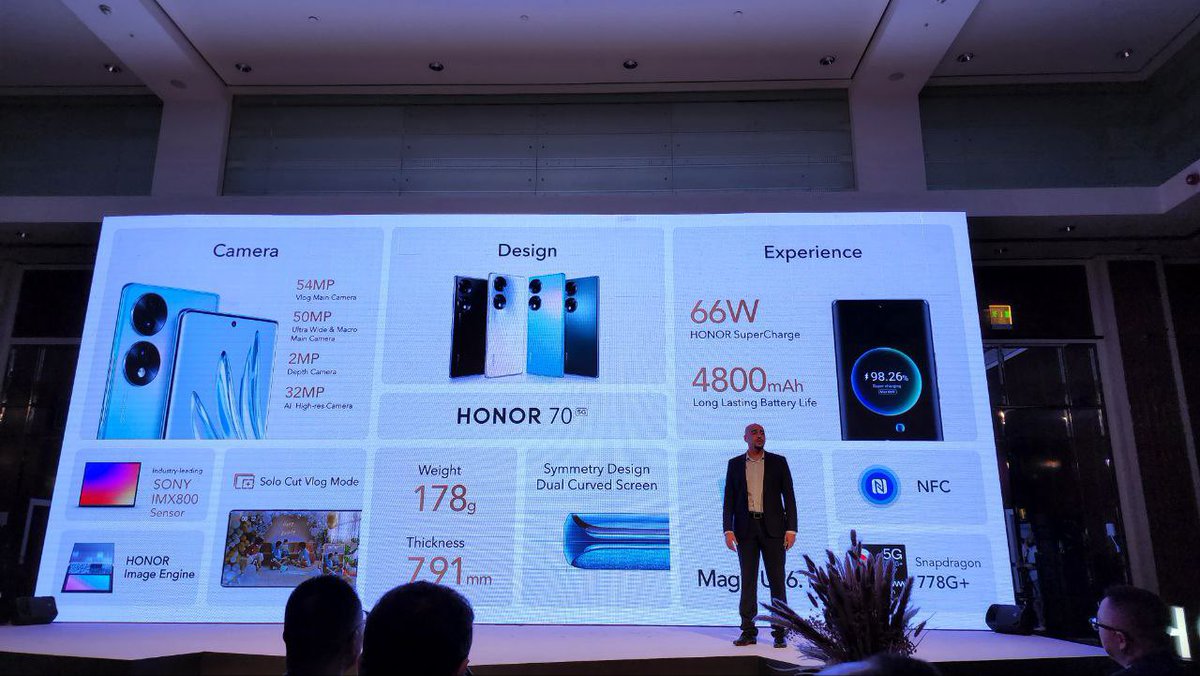 تم الإعلان عن Honor 70 واللي يجي بشاشة منحنية من نوع الـOLED بحجم 6.67 انش بدقة 2400X1080، بتردد 120Hz. الجوال يجي بثلاث كامرات ، الاساسية تجي بدقة 54MP وتمتلك مستشعر سوني IMX800 والكاميرا الثانية عريضة والثالثة للعمق.