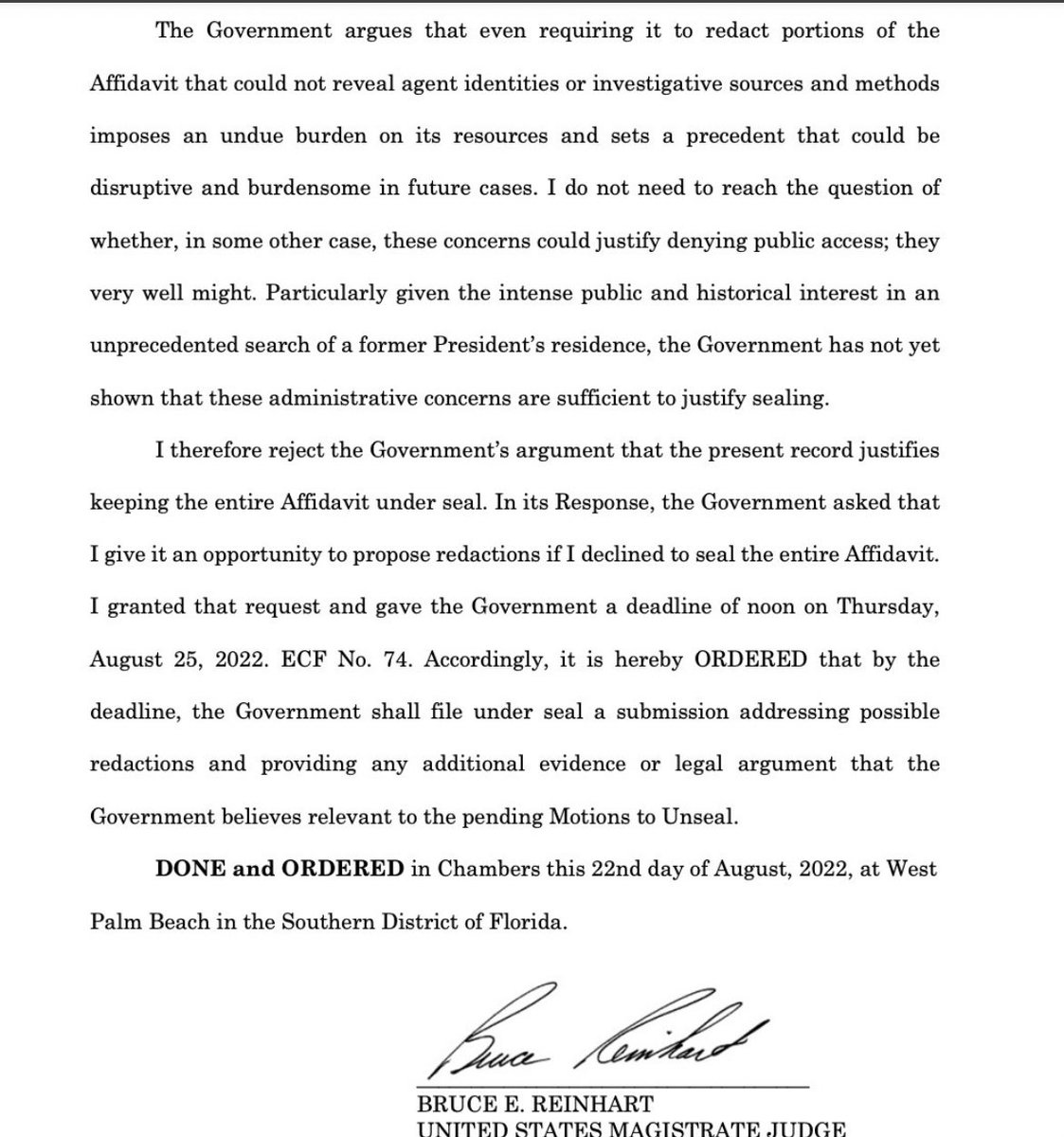 "بالنظر إلى الاهتمام العام والمداهمة غير المسبوقة لمقر إقامة رئيس سابق ، لم تثبت الحكومة أن هذه الشواغل كافية لتبرير إبقاء السرية على الإفادة الخطية. ولذلك ، فإنني أرفض حجة الحكومة بأن السجل الحالي يبرر إبقاء الإفادة الكاملة سرية".