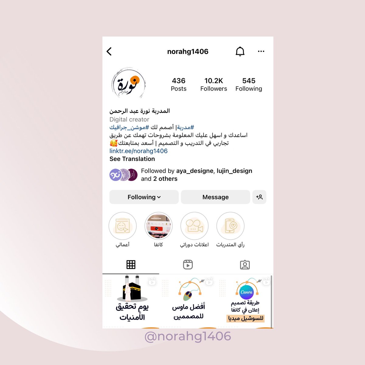 المدربة نوره تعلمت الكثيير منها واستفدت من حساباتها في السوشال ميديا كلها في شرح كانفا والتصميم ❣️