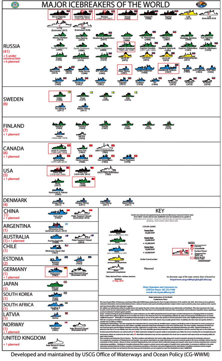 📍مازلت الغلبة لصالح الدولة الروسية 🇷🇺 بسبب الكم الكبير من كاسحات الجليد حيث يبلغ عددها 41 مقابل 5 لصالح الولايات المتحدة الأمريكية 🇺🇸.