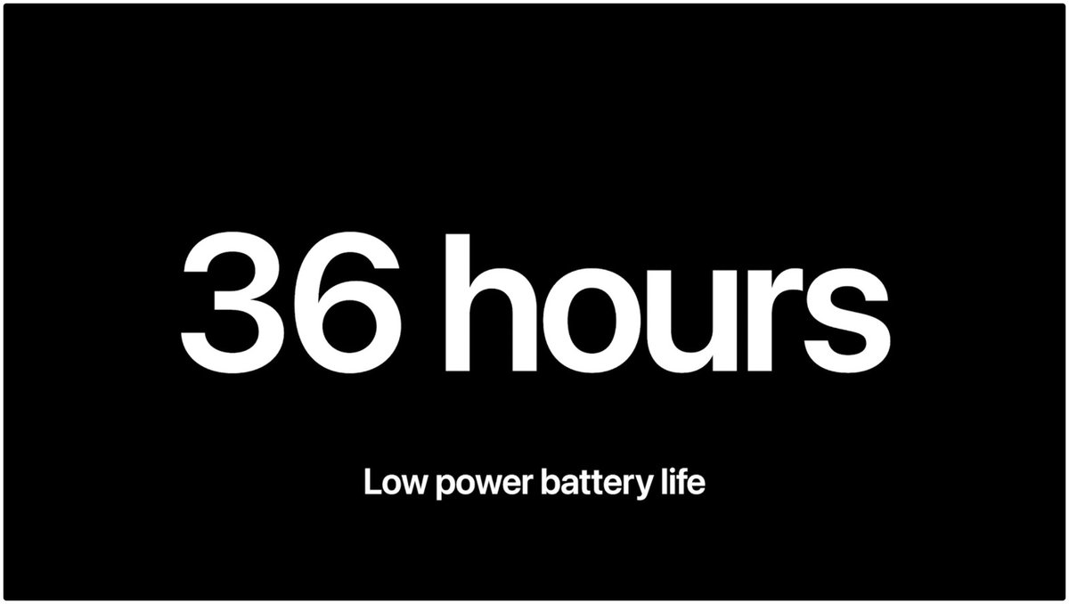 عمر بطارية يوصل إلى 18 ساعة، ولكن أبل اضافت وضع "الطاقة المنخفضة" واللي يعطي حتى 36 ساعة من عمر البطارية بشحنة واحدة ، ولكن هذا النمط يعطل بعض الخصائص زي الشاشة اللي تشتغل بشكل دائم وميزة اكتشاف التمرين بشكل تلقائي