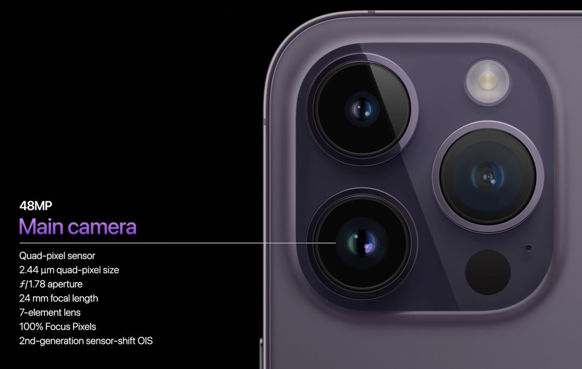 الكاميرا الاساسية في سلسلة الايفون 14 برو تجي بدقة 48MP مع مستشعر Quad Pixel ويساعد في سحب الإضاءة بشكل افضل، وتدعم مثبت الـ OIS بجيله الثاني ويعطي ثبات اعلى في تصوير الفيديو
