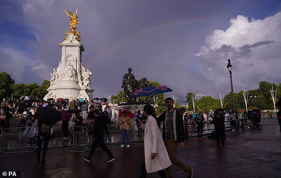 بعد هطول الأمطار ظهر قوس الالوان فوق قصر باكنغهام ونصب الملكة فيكتوريا التذكاري.