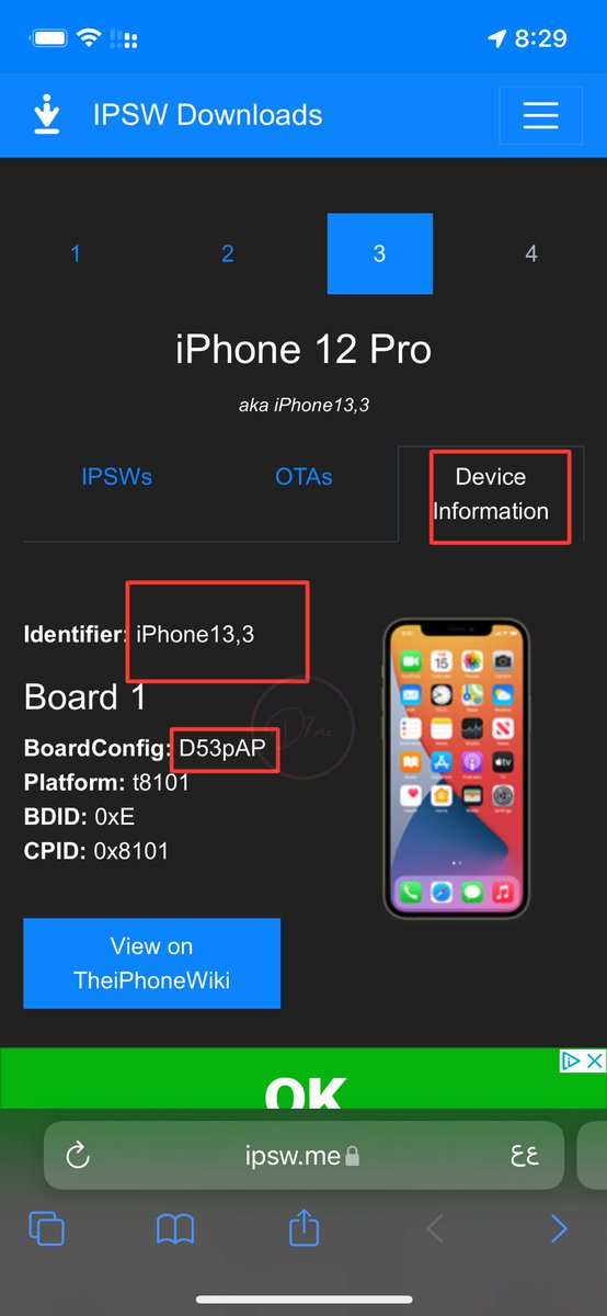 الذهاب الى موقع ipsw.me > ثم اختيار نوع الجهاز > ثم حدد الجهاز نقول مثلاً ايفون 12 > ثم اختر Device Information > ثم تأكد ان رقم الـ Identifier هو نفس جهازك > ثم في الاسفل تحصل رقم الـBoardConfig
