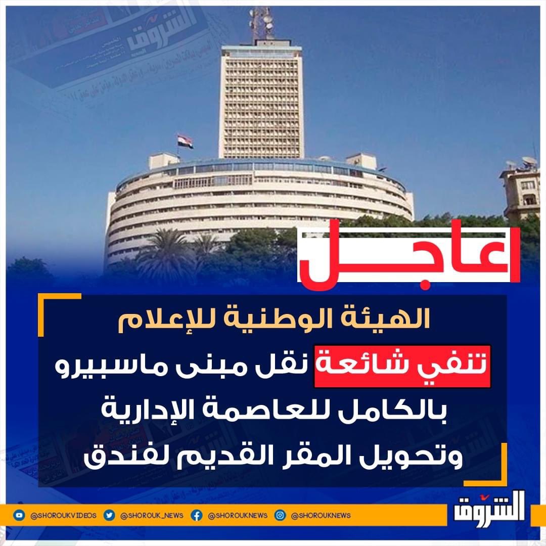١- الهيئة الوطنية للإعلام هى مصدر نفي نقل مبنى ماسبيرو ونفي بيعه وتحويله لفندق. نقلت الشروق النفي كاملاً ونوهت عنه في بانر خاص.