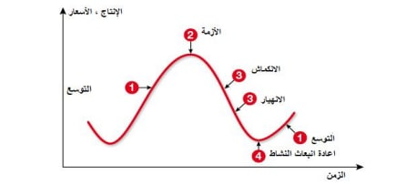 دروة #النمو_الاقتصادي توسع وفيها الانتعاش والرواج ثم تضخم ثم ركود ثم كساد ثم يعود الانتعاش =