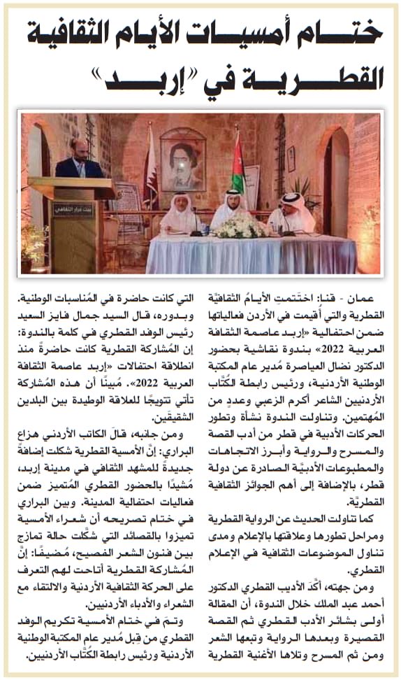 تشرفت خلال الأسبوع الماضي بتمثيل دولة قطر ضمن وفد أدبي إلى الأردن شارك في احتفالات إربد عاصمة الثقافة 2022 برئاسة الأخ جمال فايز ومشاركة الزملاء: محمد السادة، د.أحمد عبدالملك، وعبدالحميد اليوسف