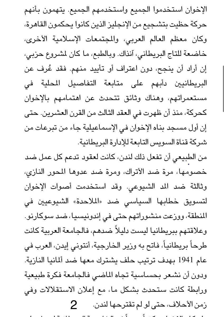وقد استخدمت أصوات #الإخوان لتسويق خطابها السياسي ضد «الملاحدة» الشيوعيين في المنطقة، ووزعت منشوراتهم حتى في #إندونيسيا، ضد سوكارنو. وعلاقتهم ببريطانيا ليست دليلاً ضدهم، ف #الجامعة_العربية كانت طرحاً بريطانياً، فاتح به وزير الخارجية، أنتوني إيدن، العرب في عام 1941 بهدف