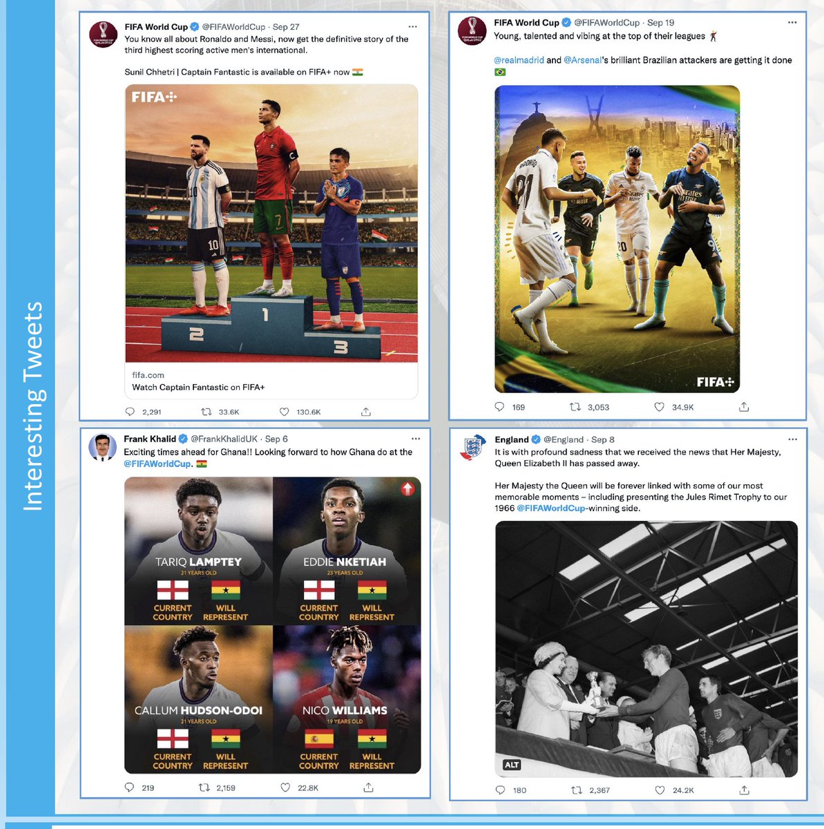 بالإشارة للمحتويات الأعلى تفاعلاً خلال شهر سبتمبر 2022 في #تويتر حول #كأس_العالم_قطر_2022 نصف المحتويات ترجع لحساب فيفا كأكثر المحتويات تفاعلاً