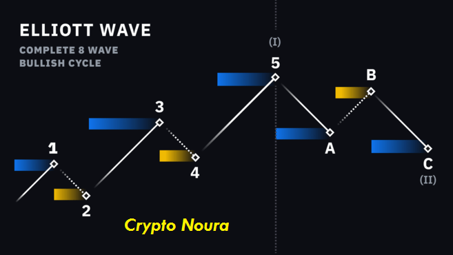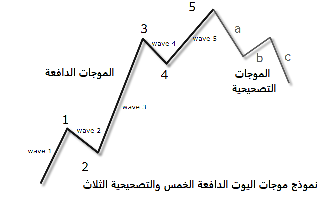 فوفقًا لملاحظات اليوت يتحرك السوق المتجه في نمط موجات من خمس إلى ثلاث من الموجات حيث تتحرك الموجات الخمس الأولى والتي كانت تسمى في البداية الموجات الرئيسية ثم أصبح يطلق عليها الموجات الدافعة في الاتجاه الأكبر