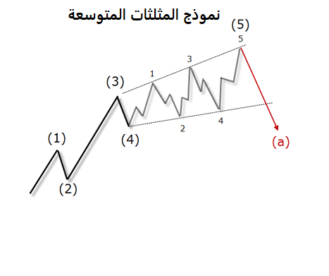 وهناك أيضًا ما يسمى بـ المثلثات المتوسعة وهي نادرة جدًا كنمط من موجات اليوت وفي كتاب “المشاعر في سوق الفوركس” يوضح جيمي سايتيل سبب عدم تكرار هذه النماذج بقوله: ” فكر في سبب ندرة المثلث المتوسع