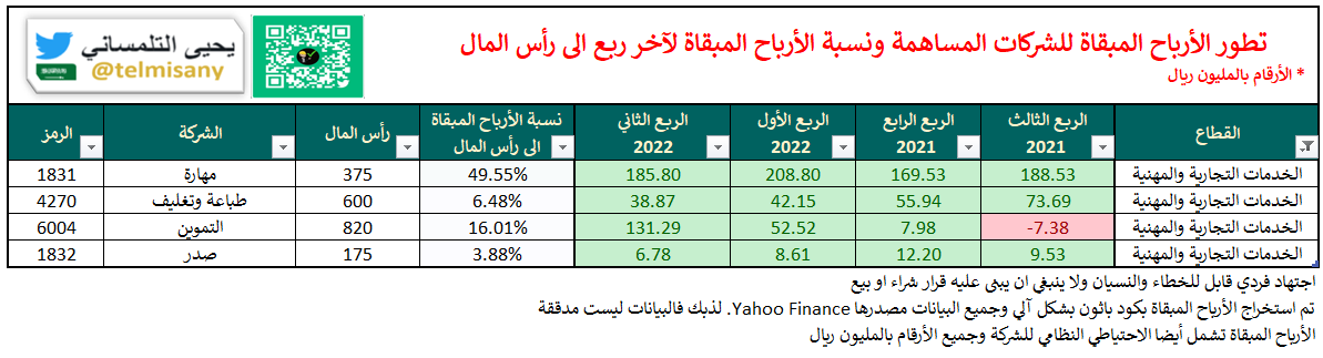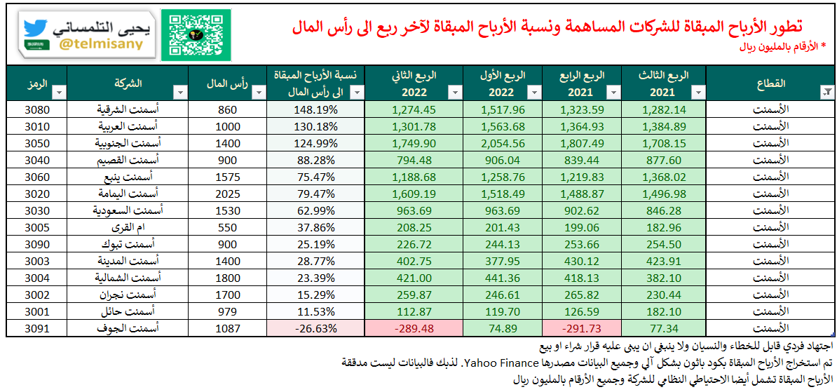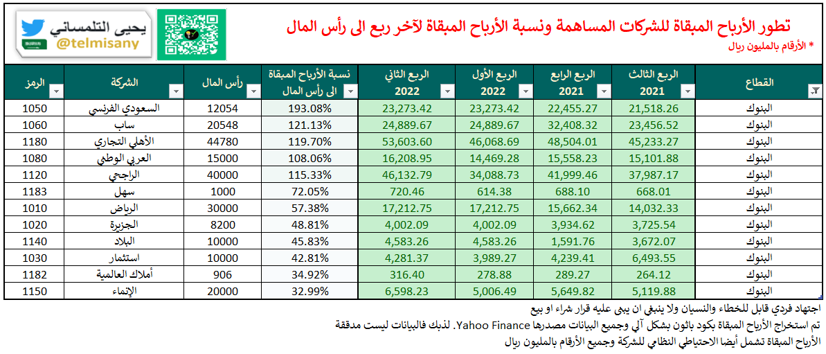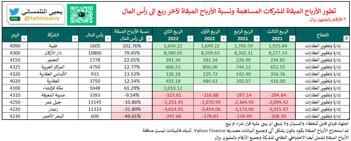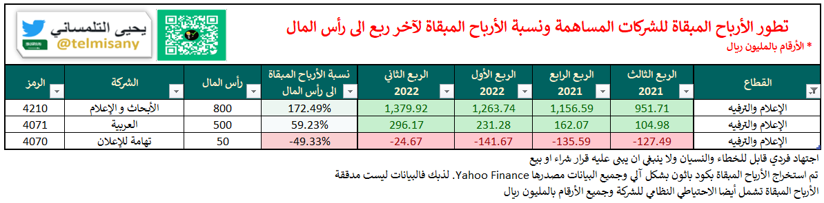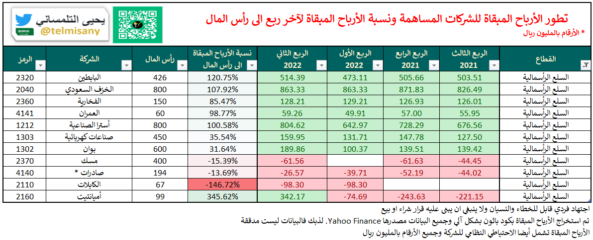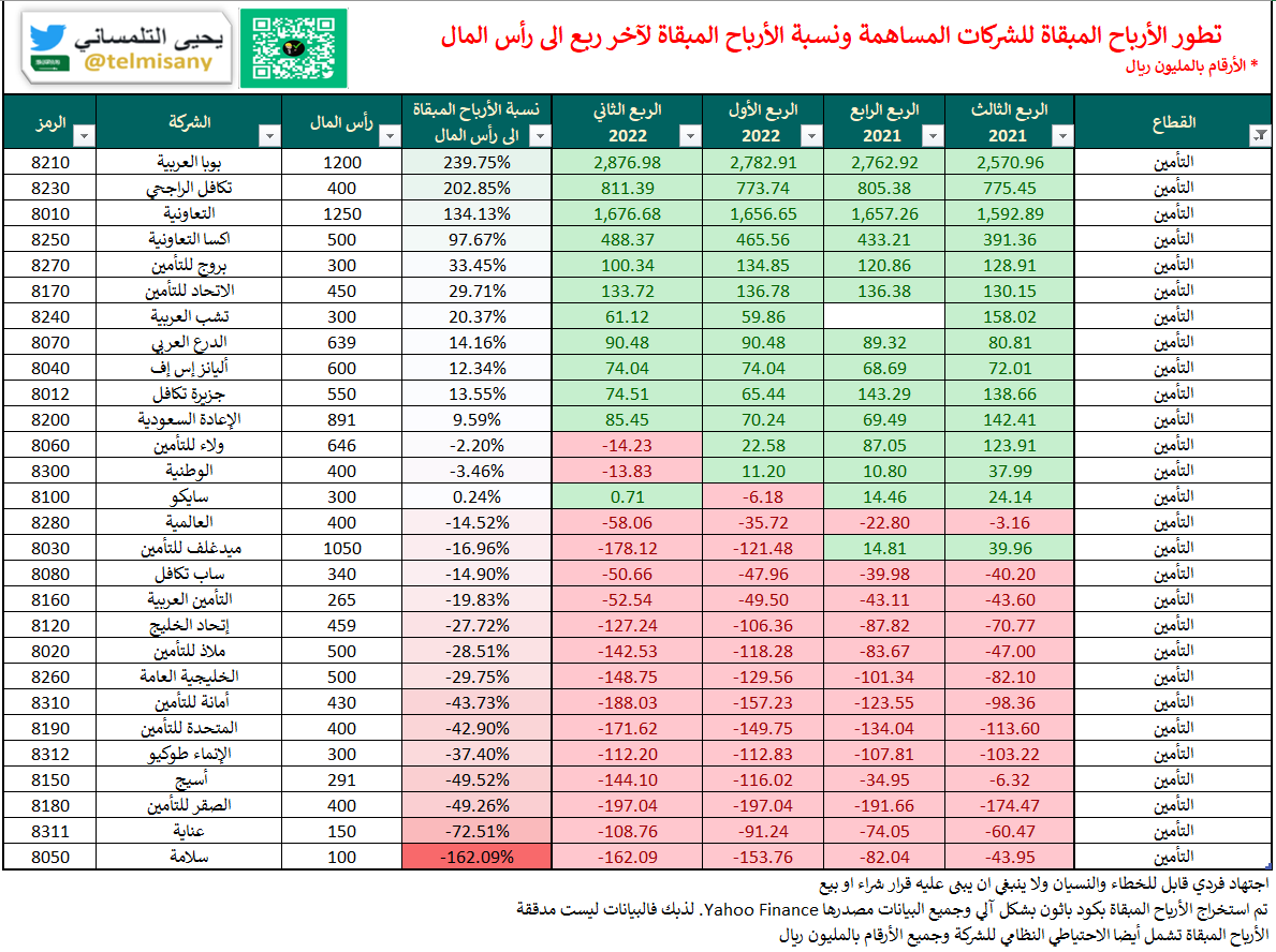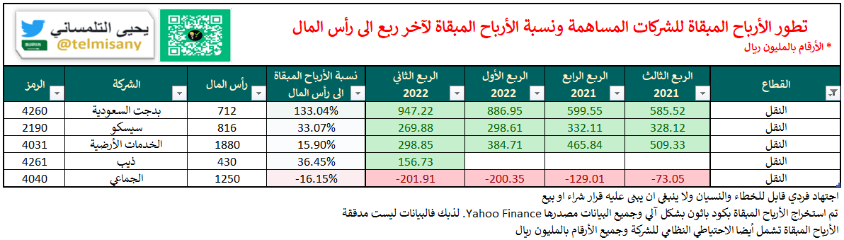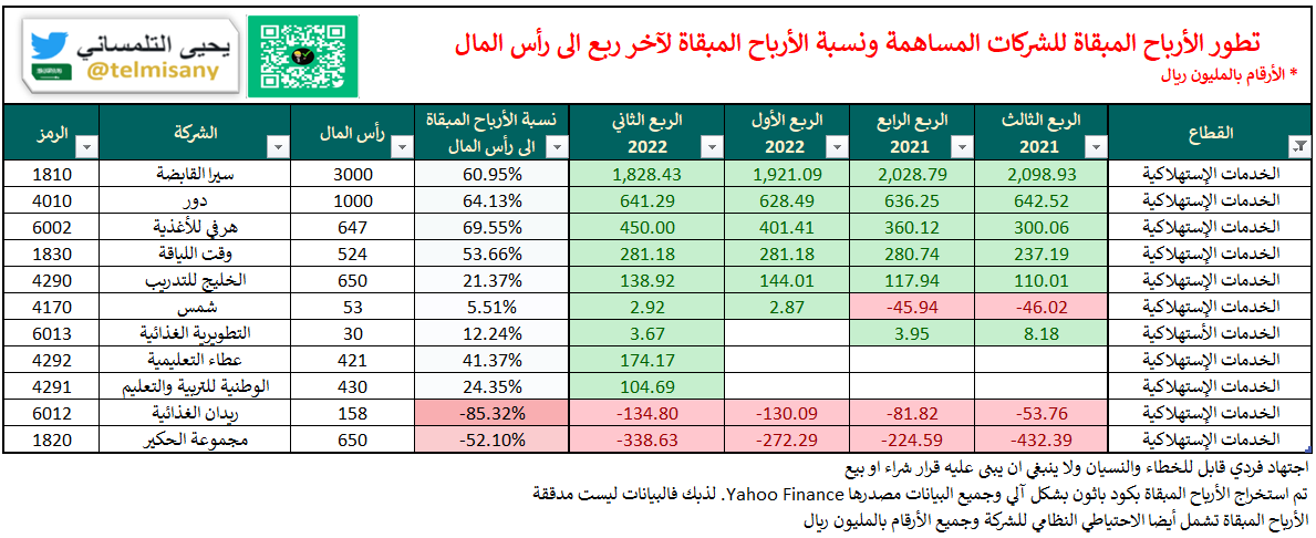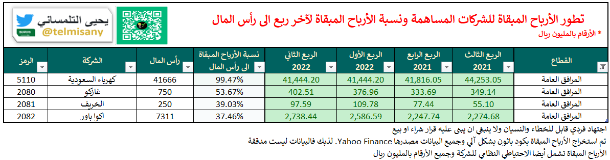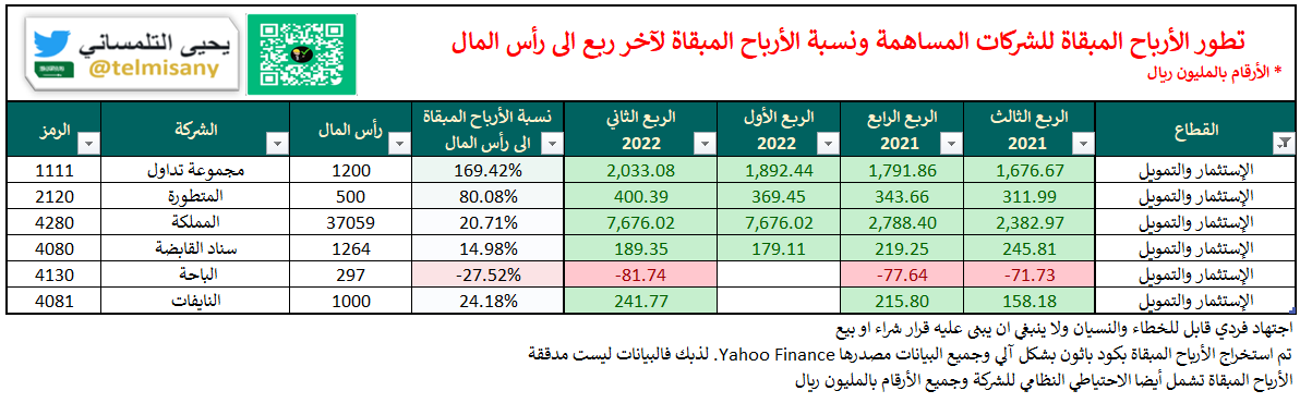 قبل اعلان الشركات ل #النتائج_المالية تعرف على الأرباح المبقاة والخسائر المتراكمة لجميع الشركات بنهاية "الربع الثاني 2022"