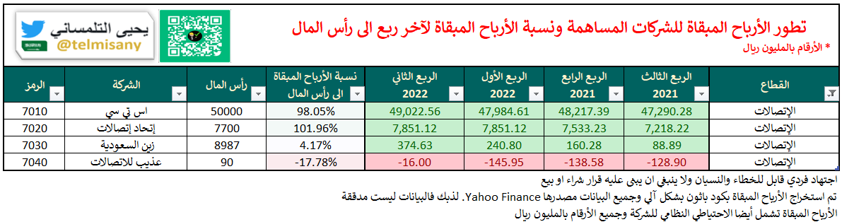 الأرباح المبقاة/الخسائر المتراكمة لقطاع #الاتصالات بنهاية "الربع الثاني 2022"