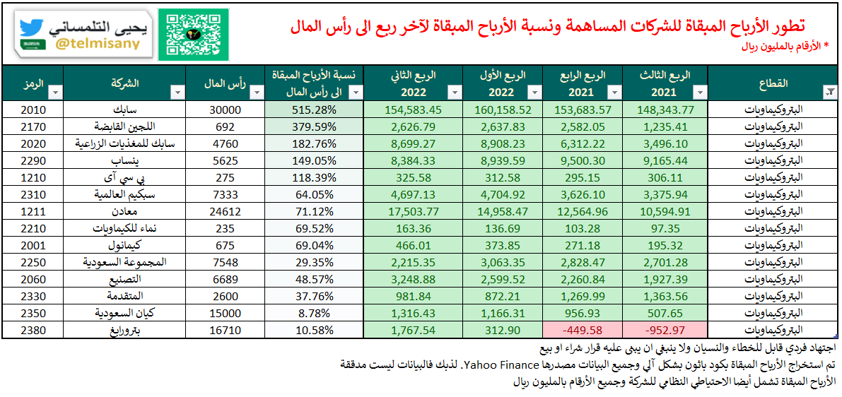 الأرباح المبقاة/الخسائر المتراكمة لقطاع #البتروكيماويات بنهاية "الربع الثاني 2022"