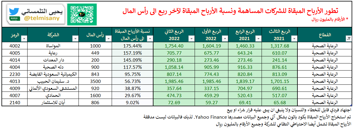 الأرباح المبقاة/الخسائر المتراكمة لقطاع #الرعاية_الصحية بنهاية "الربع الثاني 2022"