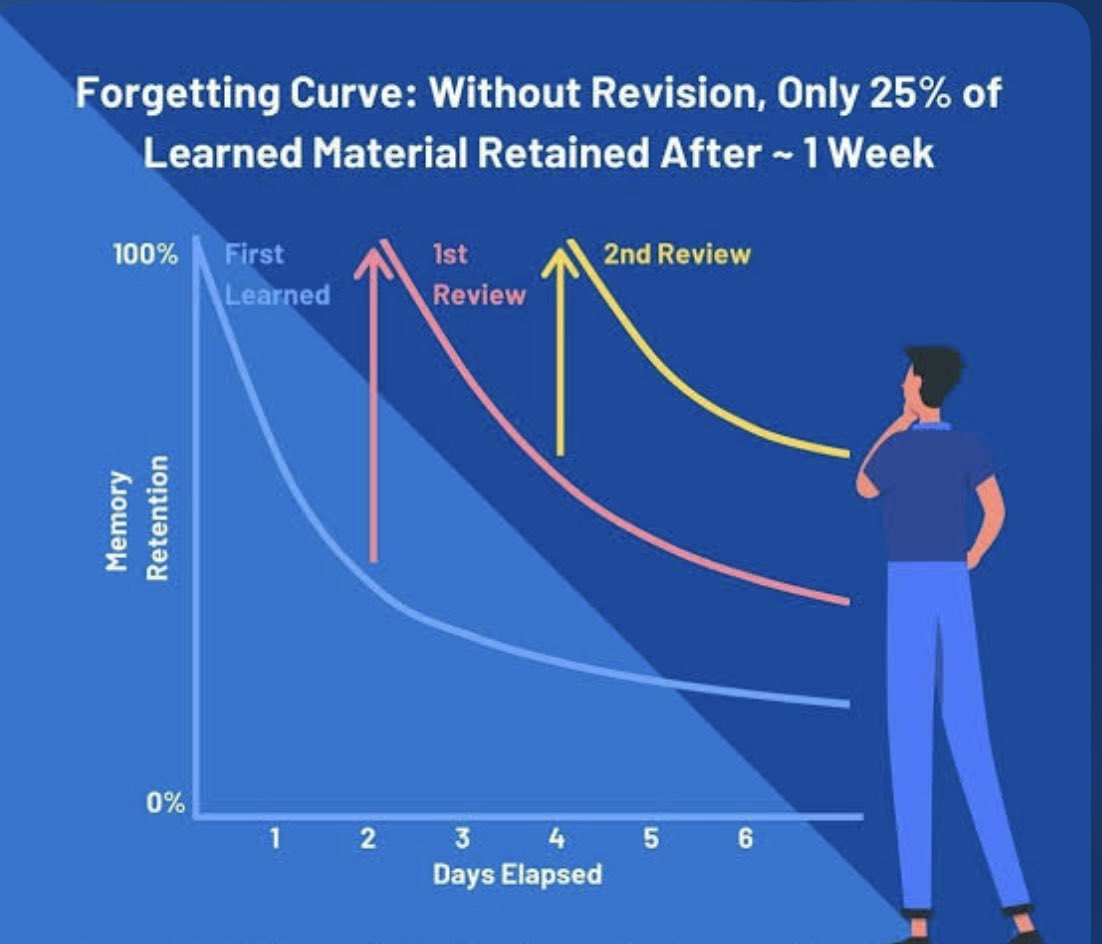 غرضنا من اي معلومة ناخذها اننا نخزنها في الذاكره طويلة الأمد "long-term memory "عشان نستفيد منها للاختبار والحياه، وهالشئ مايحصل من اول مره مذاكره خصوصاً لو الكميات كبيره وهالشئ طبيعي ،اي معلومة ناخذها تتخزن بشكل مؤقت في الذاكره القصيره بدليل انو بعد الامتحان تنسى كل اللي درسته.