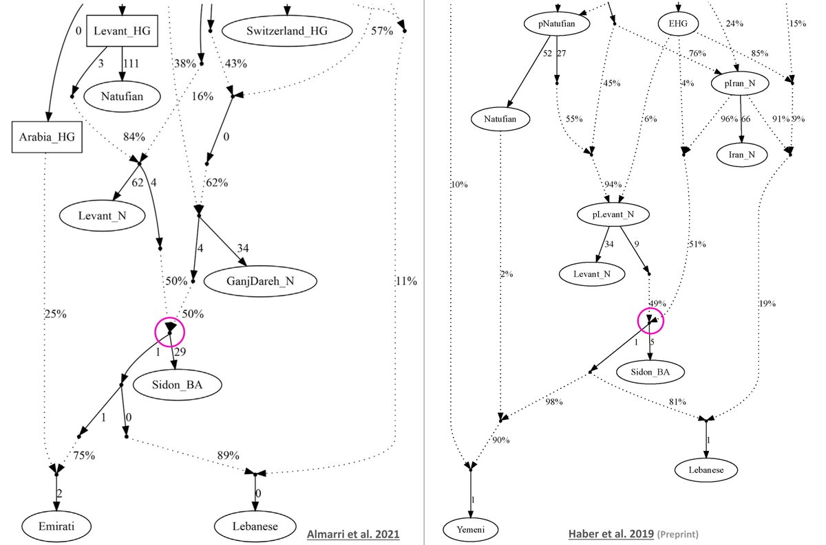 يتم نمذجة عينات الشام البرونزي بمشجرات الخلائط على أنها تشكلت من حوالي %50 من الشام النيوليثي ومن %50 من مصدر شبيه بإيران النيوليثية