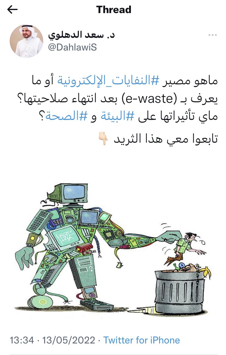 ومن هنا أوجه دعوة لرواد الأعمال والمستثمرين باستغلال هذه الفرصة "الذهبية" في إدارة النفايات الإلكترونية والتي ستعود بالنفع على المجتمع اقتصادياً وبيئياً بدعم من @ncwmsa خصوصاً أنه لا يوجد لدينا إلا القليل من المشاريع الاستثمارية في المملكة التي تهتم بتدوير النفايات الإلكترونية