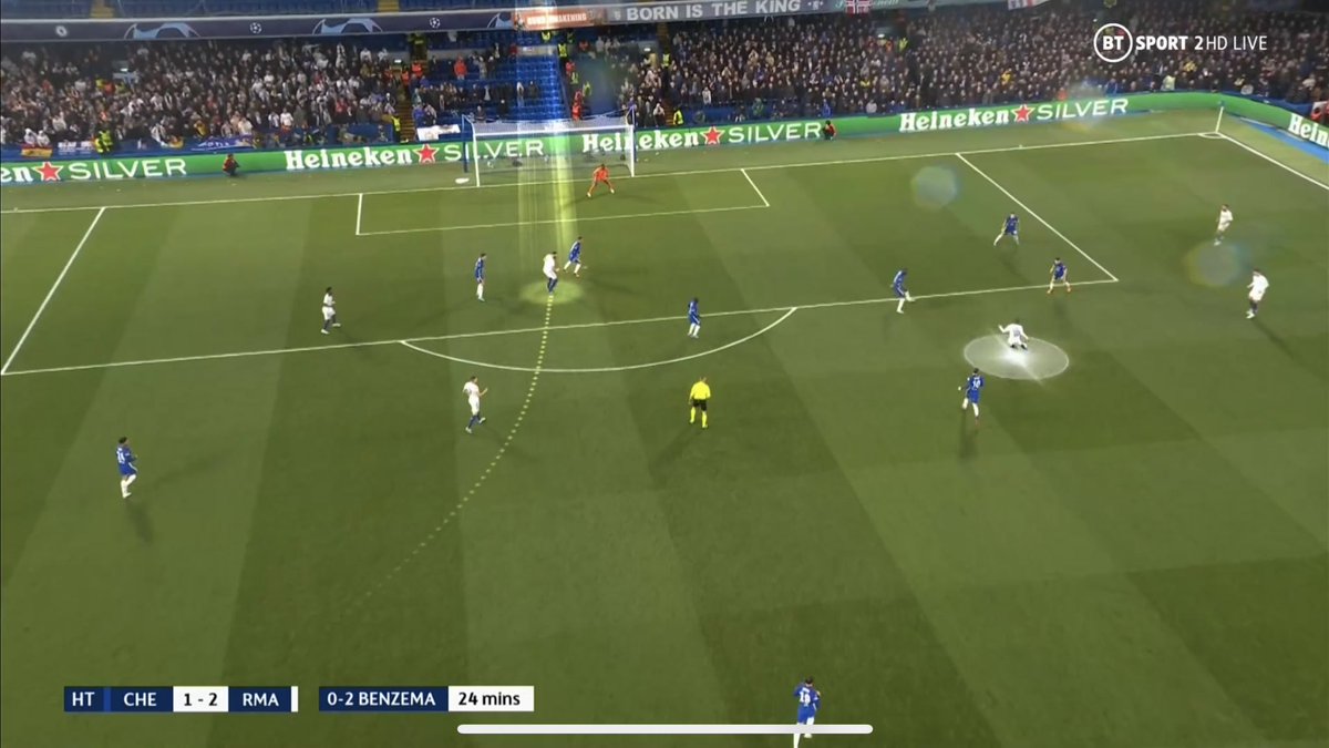 لكن ماميز انشيلوتي هنا هو قوته الهجومية، بسرعة في توقيت الضغط الي يفرضه على دفاع وحراس الخصم، السرعة بالتحولات، ادوار مختلفة لخط الوسط تعطيك افضلية بالعودة