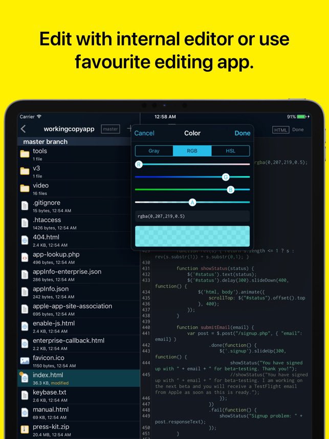 الثالث عشر هو تطبيق كتابة الاكواد البرمجية Working Copy وهو خاص بالمبرمجين وبالاضافة لكتابة الاكواد فإنه متوافق جداً مع مواقع مكتبات حزم الاكواد مثل GutHub و GitLab وغيرهما في الرفع والتحميل .. تطببق متكامل وانيق