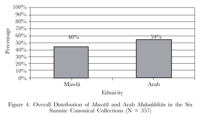 فإذا نظرنا في كتب الحديث الستة (البخاري - مسلم - الترمذي - النسائي - أبو داود - ابن ماجه) وجدنا أن غالبية المحدّثين و رواة الحديث (54%) كانوا من العرب