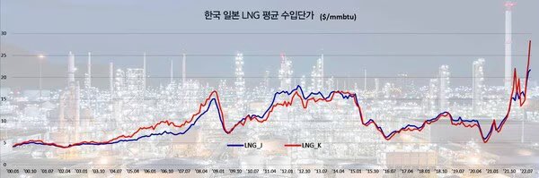 كانت الفجوة بين متوسط سعر استيراد الغاز الطبيعي المسال بين كوريا الجنوبية واليابان آخذة في الاتساع عندما بدأت الأسعار الدولية في الارتفاع بشكل حاد.