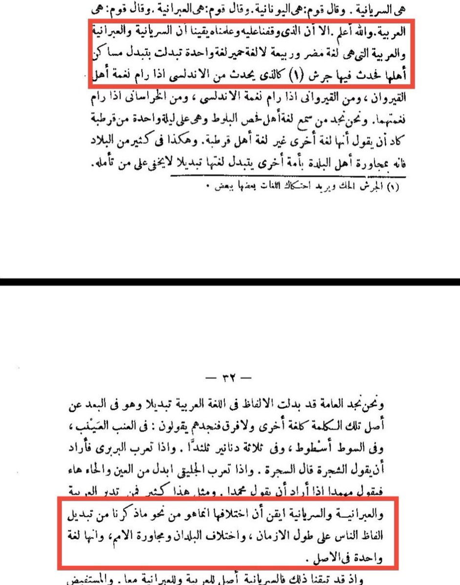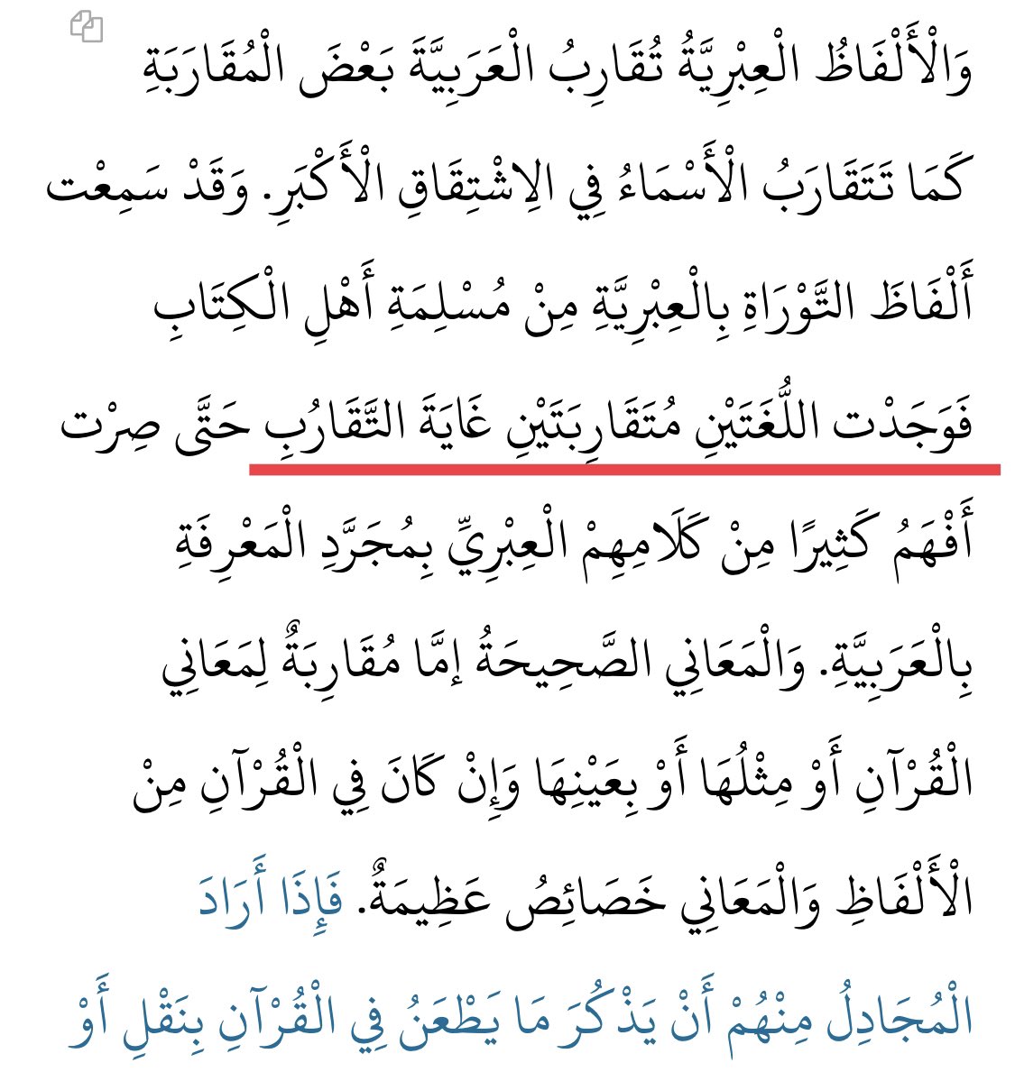 ..وَقَدْ سَمِعْت أَلْفَاظَ التَّوْرَاةِ بِالْعِبْرِيَّةِ مِنْ مُسْلِمَةِ أَهْلِ الْكِتَابِ فَوَجَدْت اللُّغَتَيْنِ مُتَقَارِبَتَيْنِ غَايَةَ التَّقَارُبِ حَتَّى صِرْت أَفْهَمُ كَثِيرًا مِنْ كَلَامِهِمْ الْعِبْرِيِّ بِمُجَرَّدِ الْمَعْرِفَةِ بِالْعَرَبِيَّةِ..