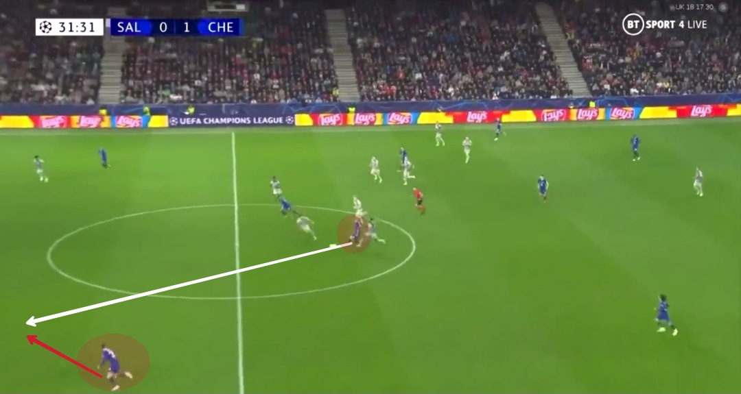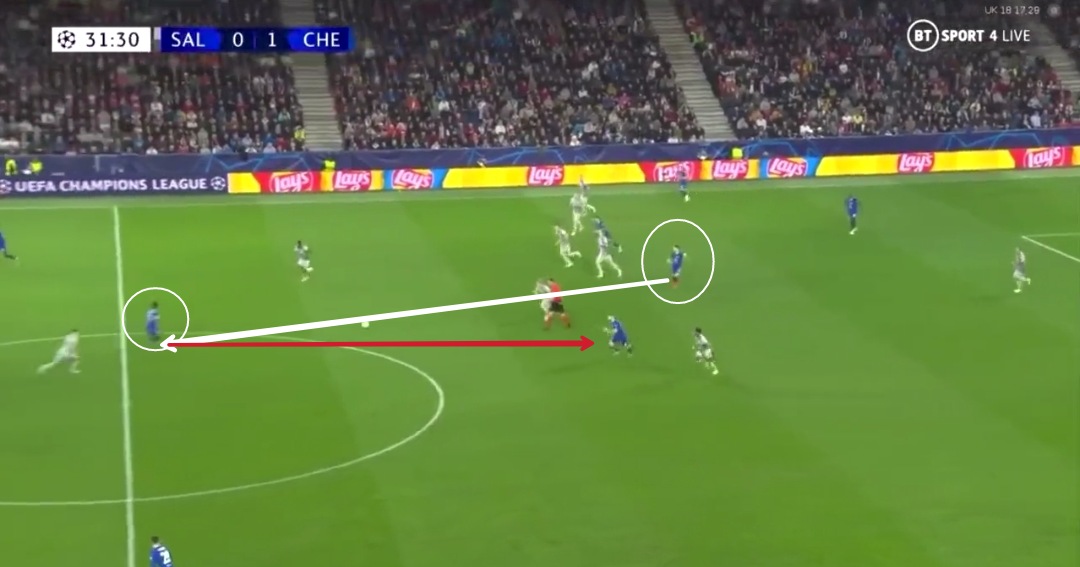 هنا احد اميز الخطط التكتيكية طبقها لاعبي تشيلسي لمقاومة ضغط سالزبورغ القوي والبناء من الخلف ثم الترحيل والانتقال. فكرة الـ double pass