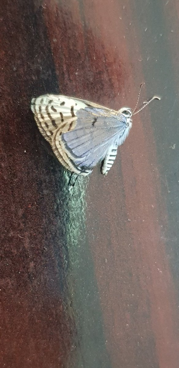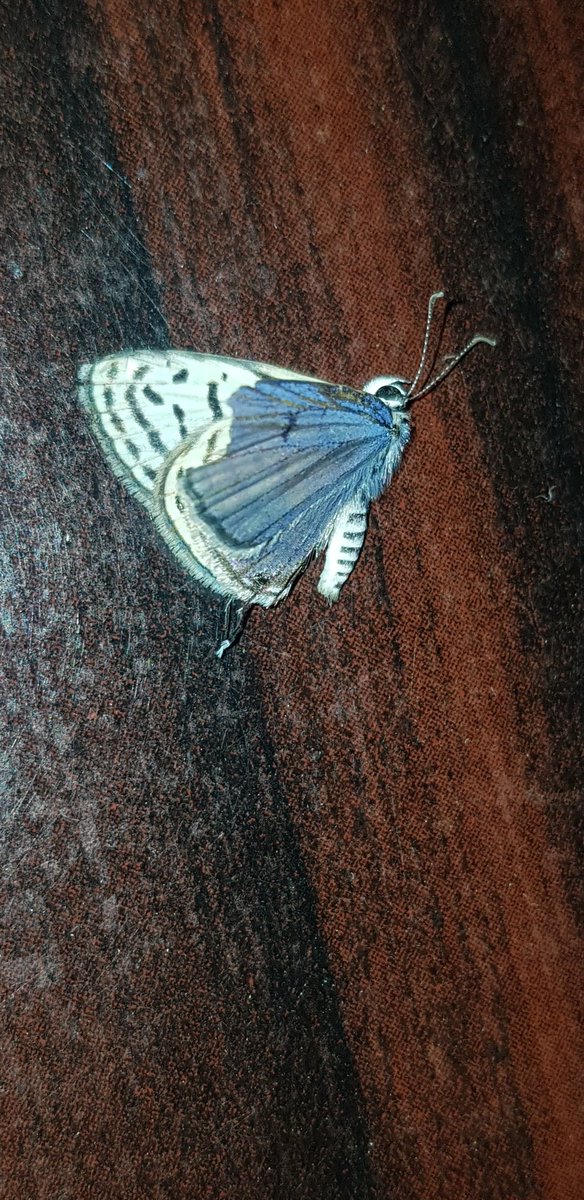 جناحها العلوي أزرق ، و الجانب السفلي مرقط