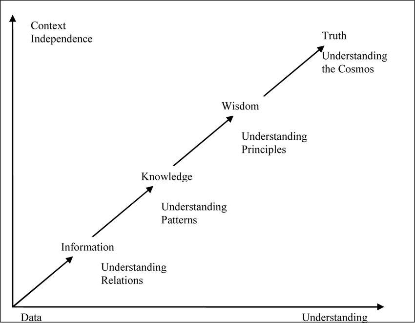 يمثل هرم DIKW العلاقات بين البيانات والمعلومات والمعرفة والحكمة. كل مستوى هو خطوة نحو مستوى أعلى؛ تأتي البيانات أولاً، ثم المعلومات، ثم المعرفة، وأخيراً تأتي الحكمة. تجيب كل خطوة على أسئلة مختلفة حول البيانات الأولية وتضيف قيمة إليها.