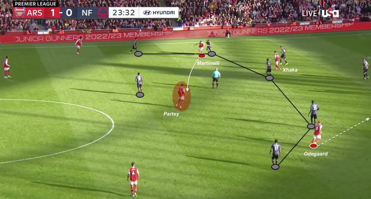 Gabriel Jesus ball retention has been key to escape from Forest density of players to recover the ball fast (4V7) and find Partey to orientate wide and rely on Nelson's excellent 1V1 skills. Forest 4-5-1 has been overthrown frequently thanks to Gabriel Jesus.