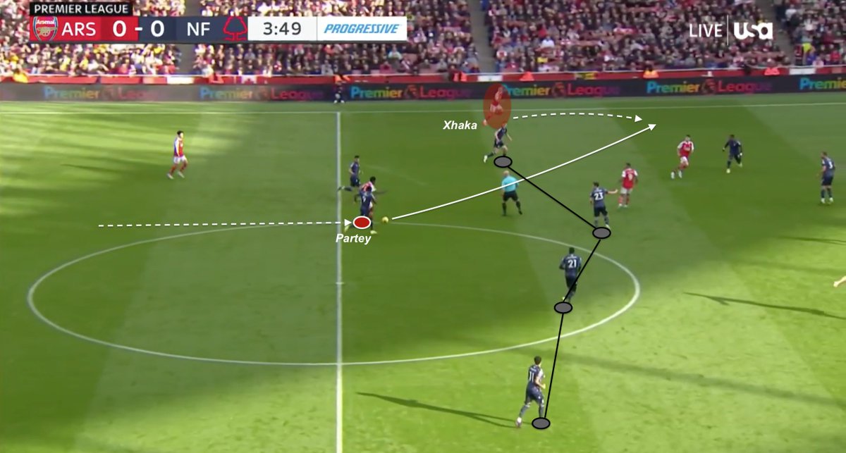 All of these patterns described above were made for these precise moments : give freedom to Xhaka and establish the Partey-Xhaka connection. The first one carries the ball, while the second one overloads the lane...
