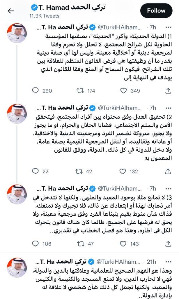 ١٠- وهذه الدعوة والعمل الحركي والطرح الفكري للعلمانية والليبرالية والديمقراطية التي يقوم بها تركي الحمد ومن يشاركونه يتماشى مع ما يقوم به الاعلام الغربي والأمريكي ضد دولتنا السعودية حفظها الله في هذا الوقت تحديداً.