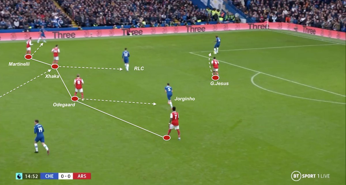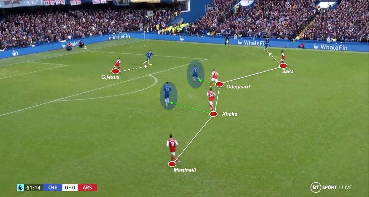 A perfect illustration here : while Arsenal build-up is about to target Saka, G.Jesus, Martinelli and Xhaka are already positioned to attack second post if White/Saka received near penalty box. Chelsea faced some issues to find parades for this pass scheme, despite its narrowness