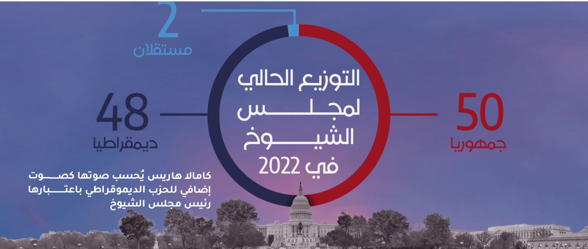 مجلس الشيوخ طبعًا حاليًا متعادل بين الجمهوريين والديمقراطيين 50/50 ولكن الكفة ترجح للحزب الديمقراطي كوّن نائبة الرئيس كامالا هاريس لديها حق "كسر التعادل في التصويت" بوصفها رئيسة مجلس الشيوخ