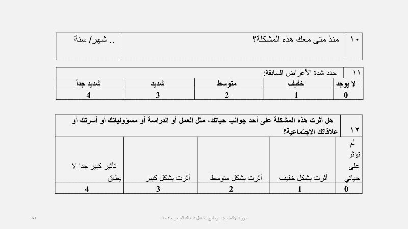 الجواب بنعم على: سؤال 1 +2 + (أي 3 أسئلة من رقم 3-8)، بحيث يكون المجموع 5 أسئلة نعم فأكثر. + (10 أو 11 متوسط فأكثر).