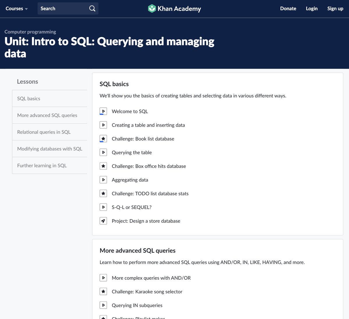 This is a site is at the top of my list for any free learning material and their SQL course is definitely a big hit.