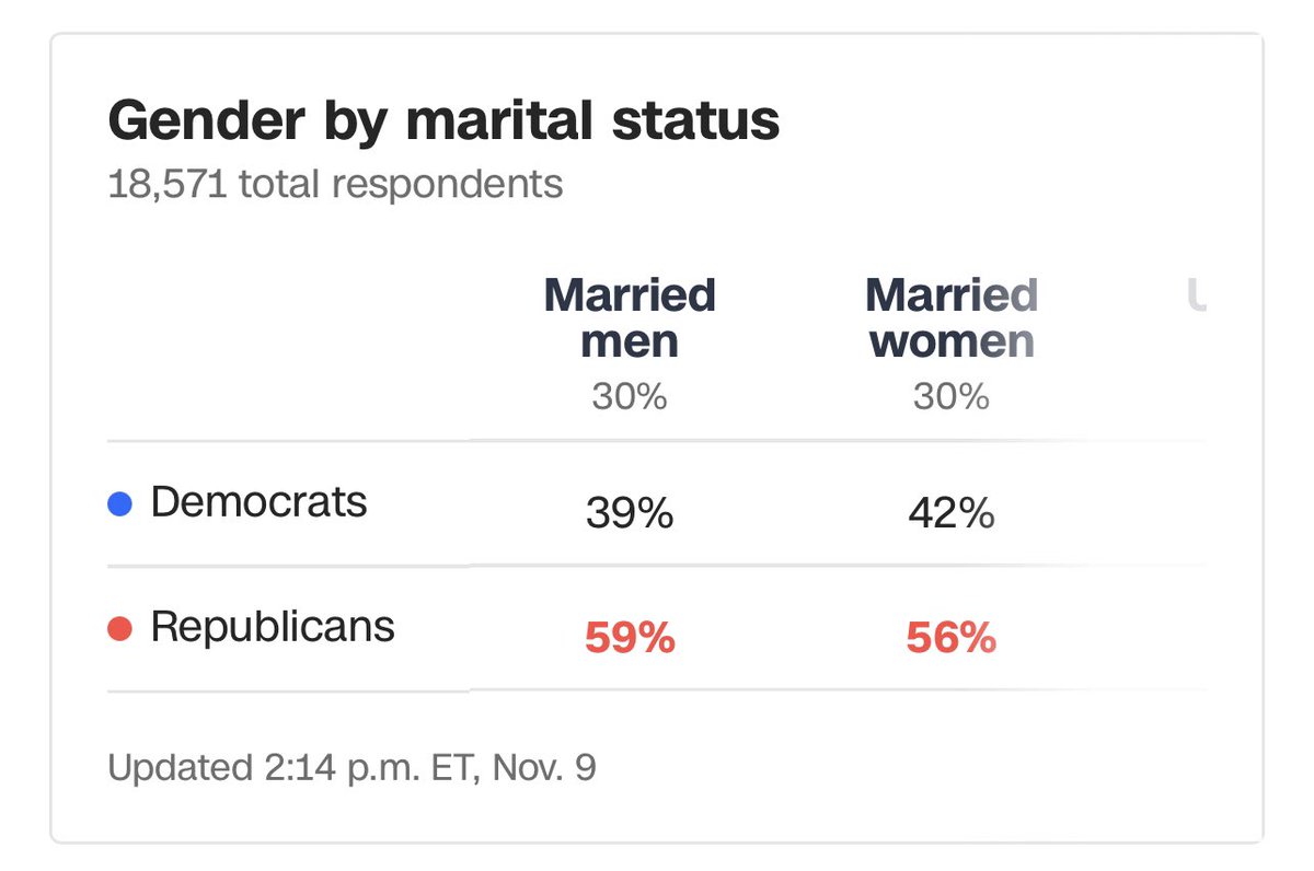 - من هالأحصائيات تشوف بأن "الزواج" من ألد أعداء الديموقراطيين ، و العكس بالنسبة لـ الجمهوريين ، فعشان كذا تلقى الفكر اليساري عموما يحاول يهدم مفهوم " الأسرة و الزواج " و يسوق لـ أي شي يساعدهم في تحقيق هذا الهدف .