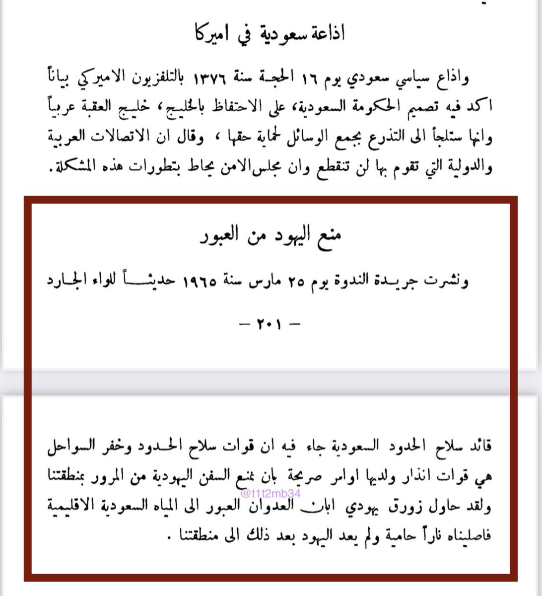 كما حذر #الملك_سعود امريكا من استخدام خليج العقبة كمياه حرة وأكد حق السعودية وسيادتها في المياه العربية واعلن ذلك في التلفزيون الامريكي 🇸🇦